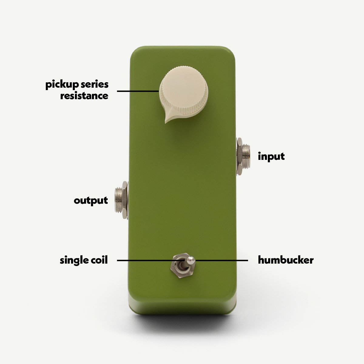 the yesterday effects pickup simulator is completely passive, no power required, and fits into a small 1590a enclosure. this circuit takes a low impedance signal and transforms it into a high impedance signal which resembles that of a passive guitar pickup. the knob adjusts the resistance of the "pickup," allowing for more approximate replication. the toggle switch offers the option of single coil inductance or humbucker inductance.